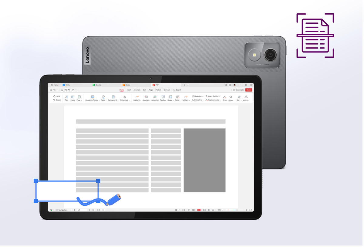 Lenovo Tab K11 tabletin kamerası, resimleri yalnızca birkaç tıklamayla anında PDF belgelerine dönüştüren ve